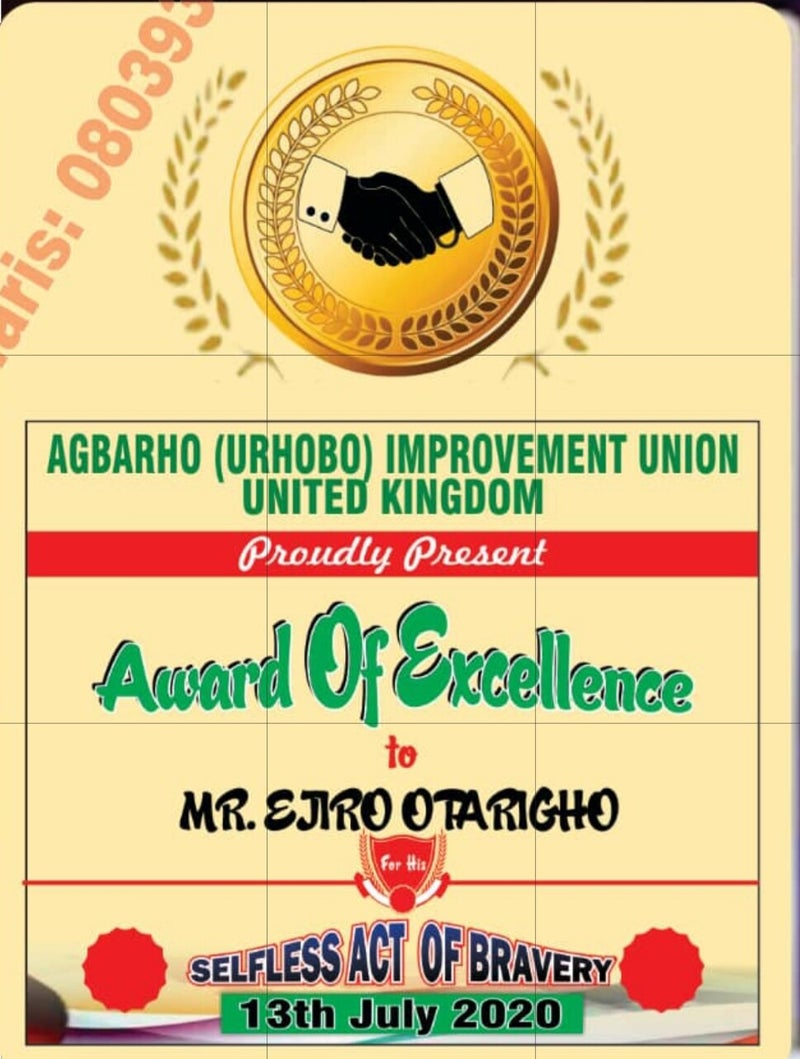 In what could had been a monumental disaster, a petrol laddened truck accidentally caught fire in June 2022 in the middle of Agbarho, however with an heroic calmness of mind, Mr Ejiro Otarigho drove the burning truck out of the town to a secluded location, away from danger and nobody was harmed nor was any life lost. In recognition for such a rare act of bravery, the AUIU UK, represented by Engineer Eric Obada, presented Mr Oterigho a Bravery Award and the sum of N100,000.