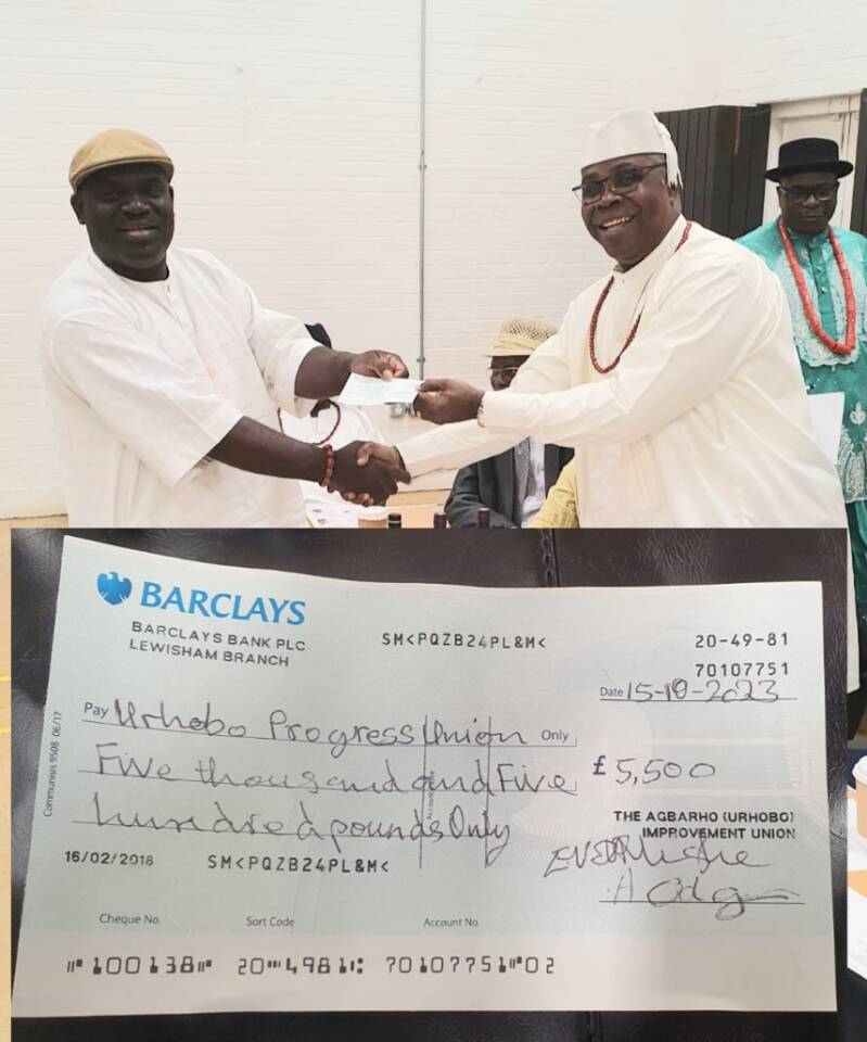 A cheque of £5,500.00 was presented by the President of AUIU UK to Chief Ejiro Uwhujabo, the National President of UPU UK.